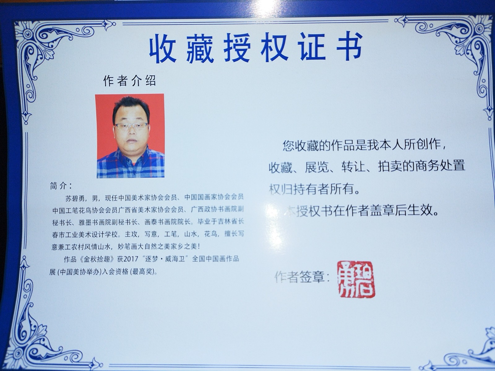 | 作者简介 | 苏碧勇(b.1976),广西桂林人。1996年毕业于长春市工业美术设计学校,中国美术家协会会员、中国国画家协会会员、中国工笔花鸟协会会员、广西壮族自治区美术家协会会员,广西政协书画院副秘书长、雅墨书画院副秘书长、画泰书画院院长。擅长写意与工笔技法,创作主题聚焦山水、花鸟及农村风情,作品致力于表现大自然之美与家乡风貌,以描绘自然与家乡风光见长,其作品多次入选国家级重要展览,并被国家级专业机构收藏。 | ||