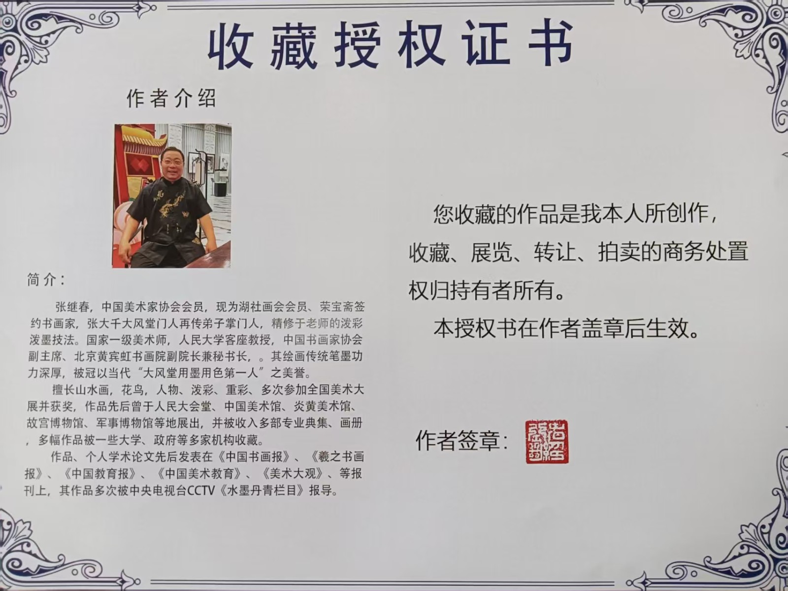 | 作者简介 | 张继春,中国美术家协会会员,国家一级美术师,现为湖社画会会员、荣宝斋签约书画家,人民大学客座教授,中国书画家协会副主席、北京黄宾虹书画院副院长兼秘书长,中国美展评委。他是张大千的再传弟子,何海霞大师的入室弟子,擅长山水、花鸟、人物、泼彩、重彩,多次参加全国美术大展并获奖,其绘画传统笔墨功力深厚,被冠以当代“大风堂用墨用色第一人”之美誉。作品先后在人民大会堂、中国美术馆、故宫博物院、军事博物馆等地展出,作品被国内外美术馆、专业画院等多家收藏。2005年被授予“中国当代书画艺术杰出成就奖”“中华当代杰出功勋艺术家”荣誉称号。2012年篆书作品《天道酬勤》荣获全国书法最高奖项“兰亭奖”。 | ||