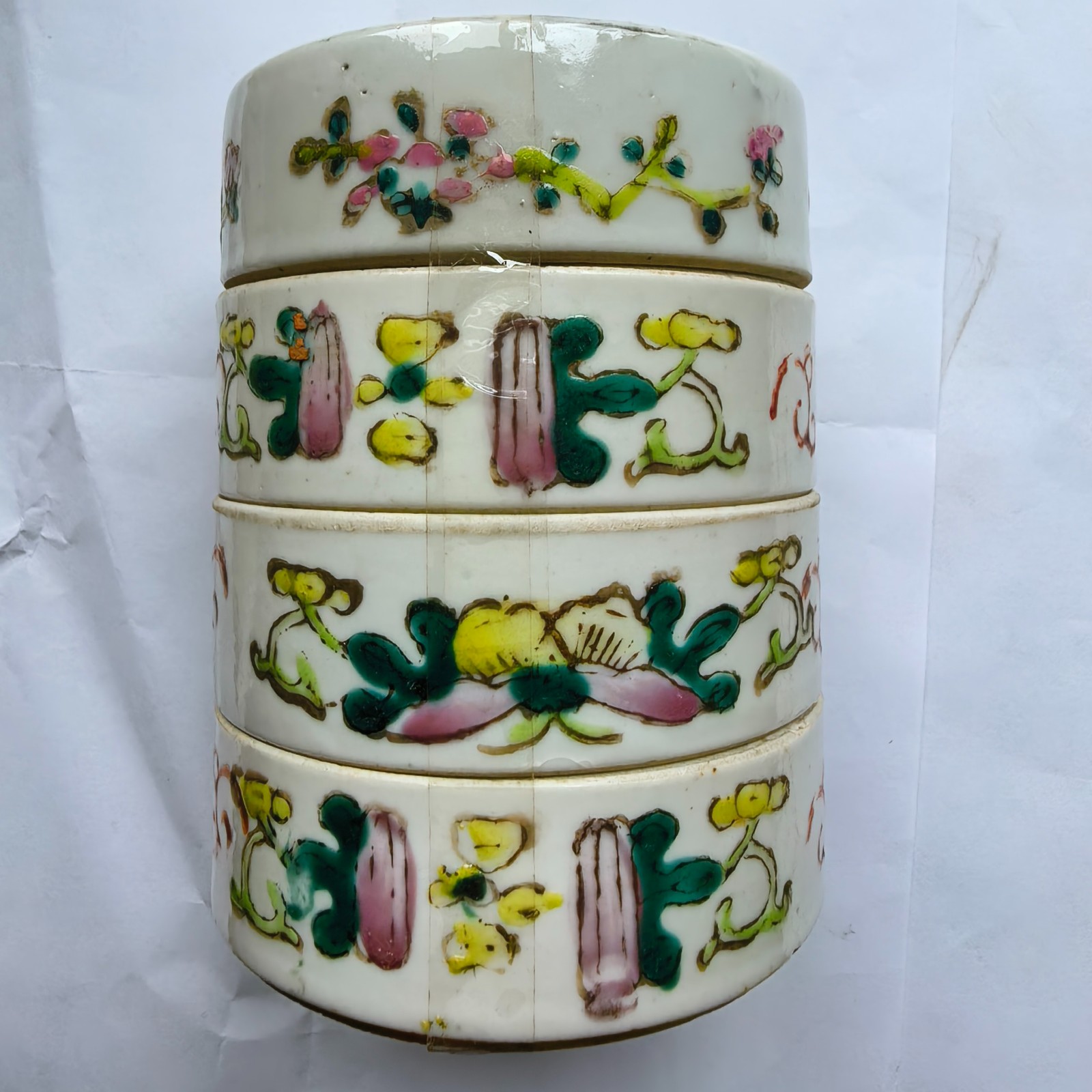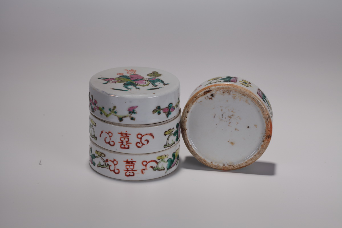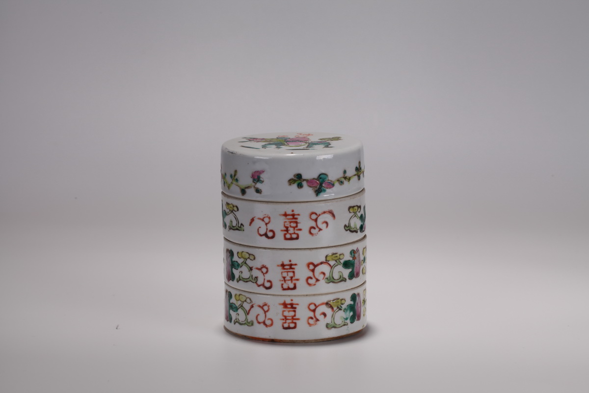 | 描述 | 拍品一节盒口沿磨,圆筒形,由高低相等的四个盒组成。盖面绘粉彩麒麟送子图案,传说中麒麟是仁兽,是吉祥的象征,能为人们带来子嗣,因此有“麒麟儿”“麟儿”一说,外壁饰双喜、瓜蝶、花卉等,寓意喜事盈门、美好如意。 | ||